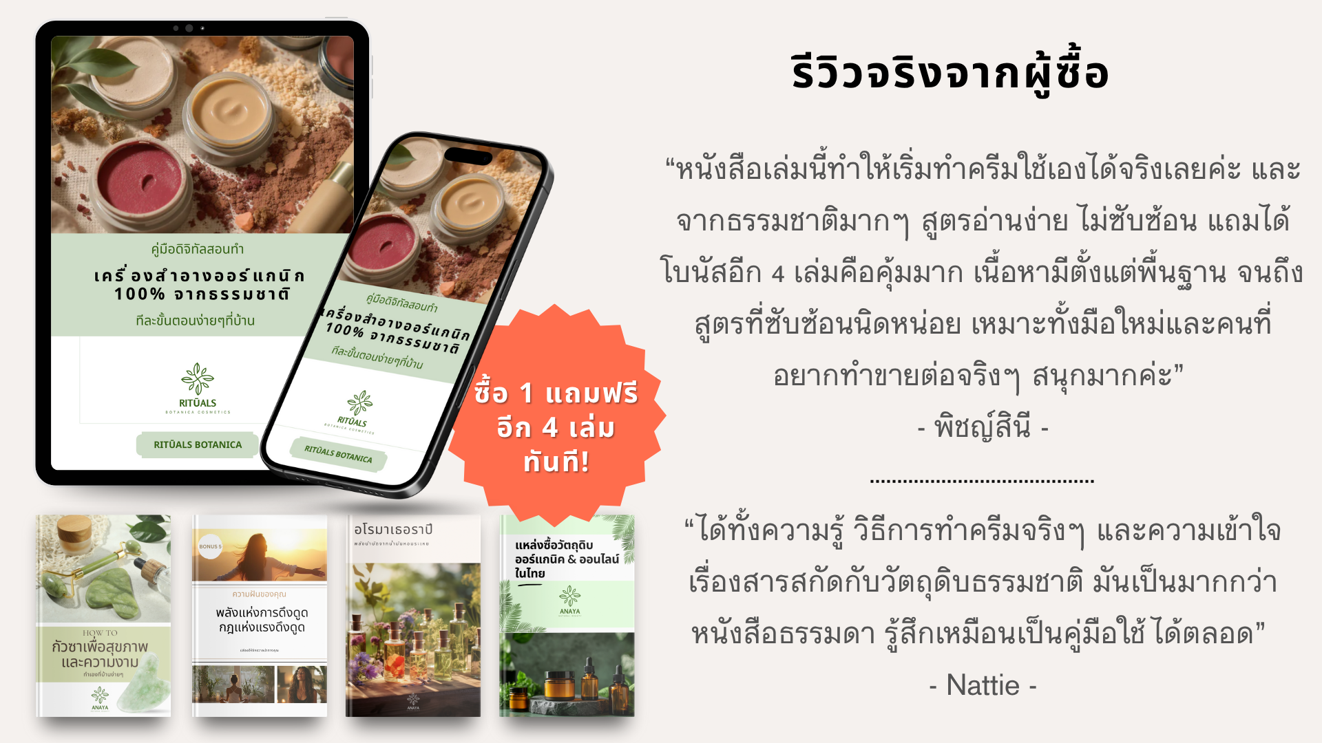 เพราะความตั้งใจของเราไม่ใช่แค่การขายหนังสือ แต่คือการพาคุณไปค้นพบความสุขของการดูแลผิวด้วยสูตรที่ปลอดภัย สุขภาพดี และเป็นธรรมชาติ 100%